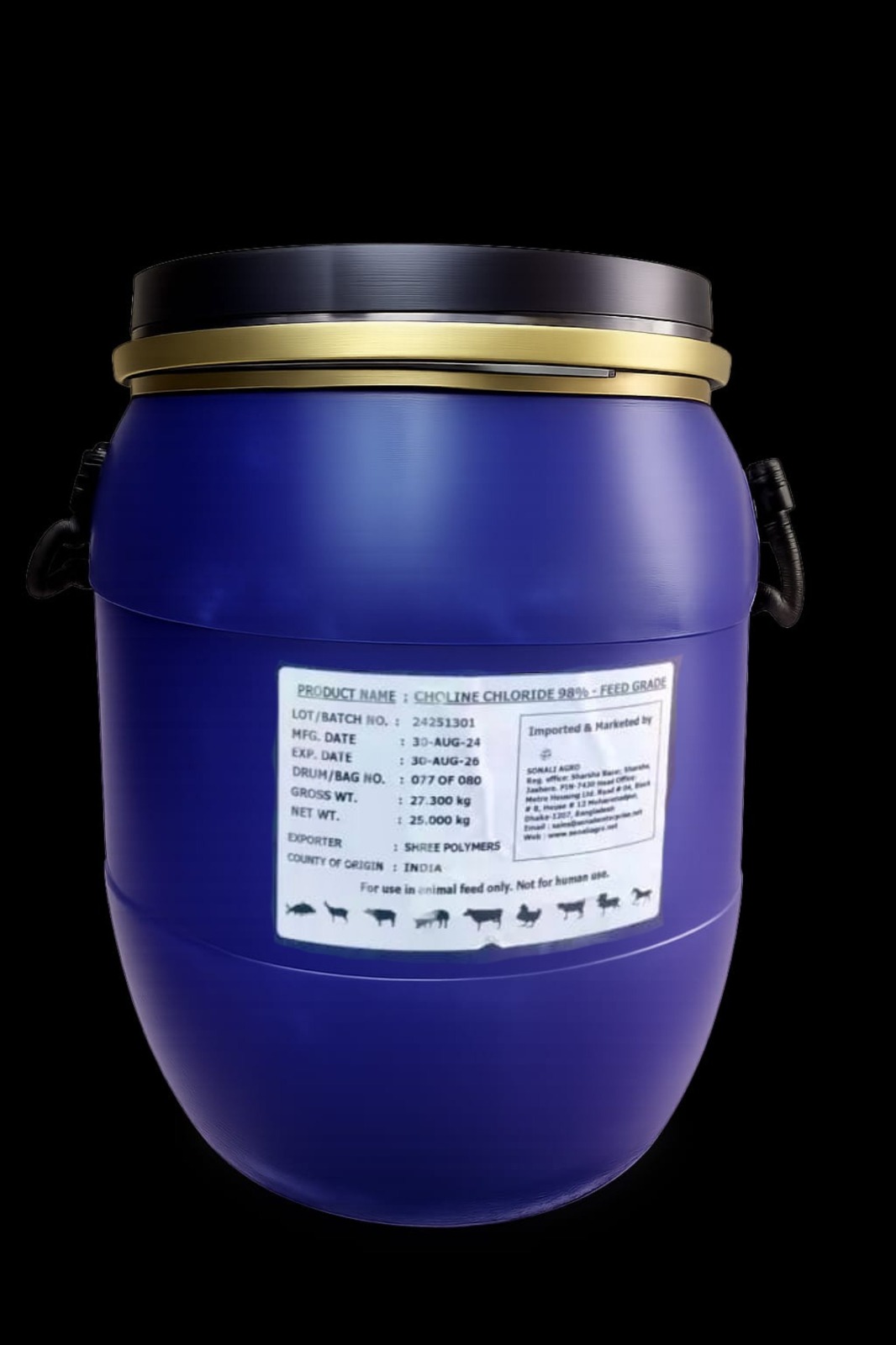 Choline Chloride 98% Feed Grade is a highly concentrated, essential nutrient widely used in animal nutrition. It plays a vital role in fat metabolism, liver function, nerve transmission, growth performance, and reproductive health across poultry, livestock, swine, and aquaculture species. It is especially effective in preventing fatty liver syndrome, improving feed efficiency, and enhancing overall productivity.
