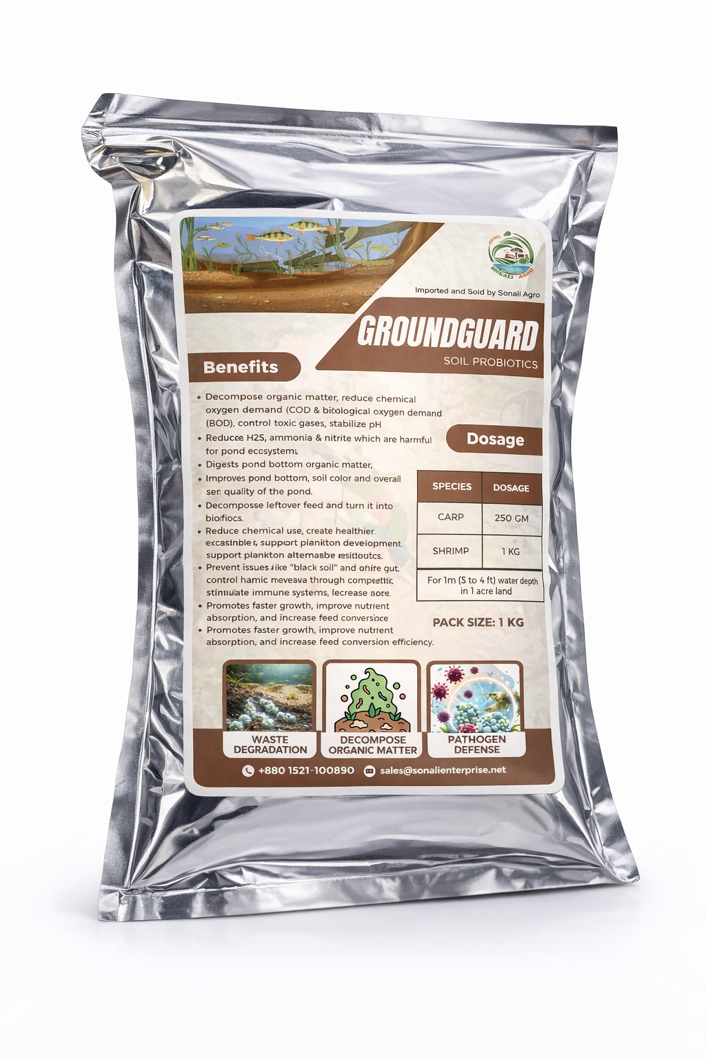 GROUND GUARD is a pond bottom probiotic that breaks down organic waste, reduces COD, BOD, and toxic gases like H₂S, ammonia, and nitrite. It improves pond bottom condition and soil quality by converting leftover feed into beneficial bioflocs. GROUND GUARD helps prevent black soil and white gut, suppresses harmful bacteria, boosts immunity, supports healthy plankton growth, and improves feed efficiency while reducing the need for chemicals and antibiotics.